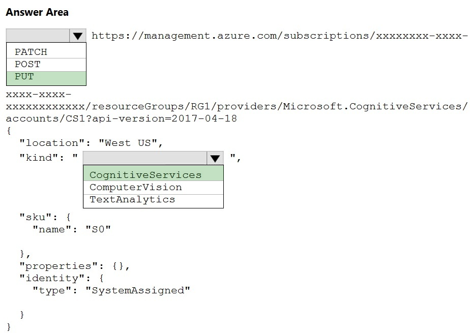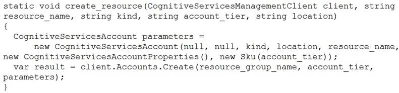 You have the following C# method for creating Azure Cognitive Services resources programmatically.