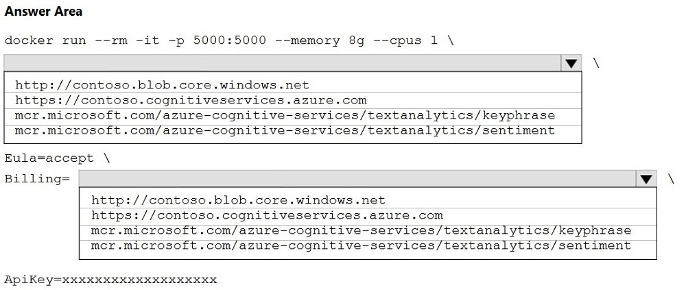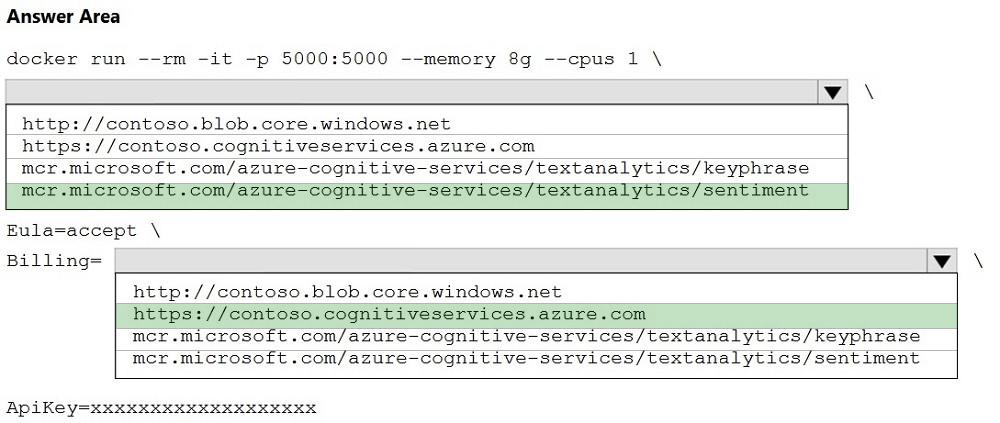 Box 1: mcr.microsoft.com/azure-cognitive-services/textanalytics/sentiment