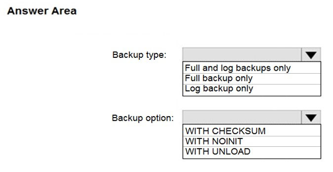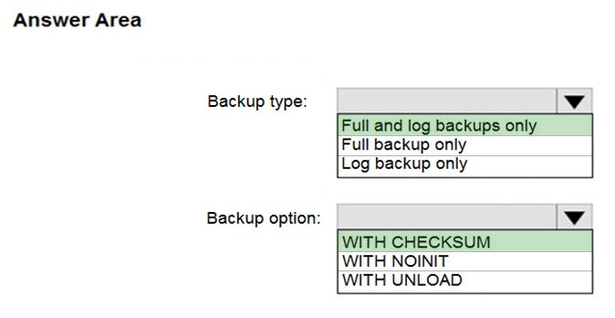 How should you configure the backup of DB1? To answer, select the appropriate options in the answer area.