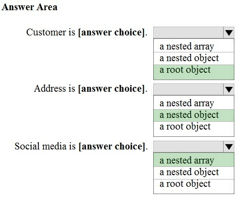 Use the drop-down menus to select the answer choice that completes each statement based on the information presented in the JSON document.