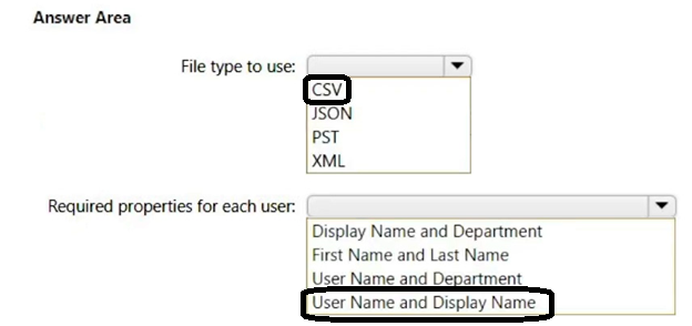 Which type of file should you use and which properties are required? To answer, select the appropriate options in the answer area.
