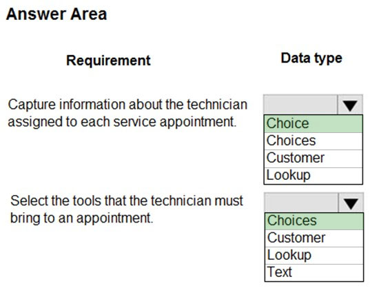 You are designing a Power Platform solution for a company that provides in-home appliance maintenance. When a customer schedules a service appointment, a dispatcher assigns one technician for a specific time and location.