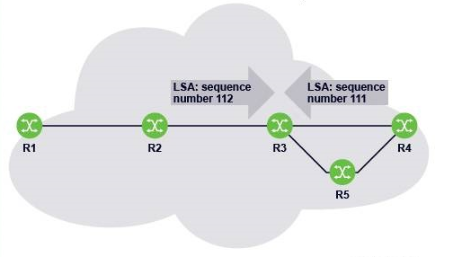 Later, it receives the same LSA but with a higher sequence number (112) from R2.