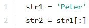 str2 = str1[:] creates a slice of str1 that includes all characters (from beginning to end). This effectively creates a copy of the string.