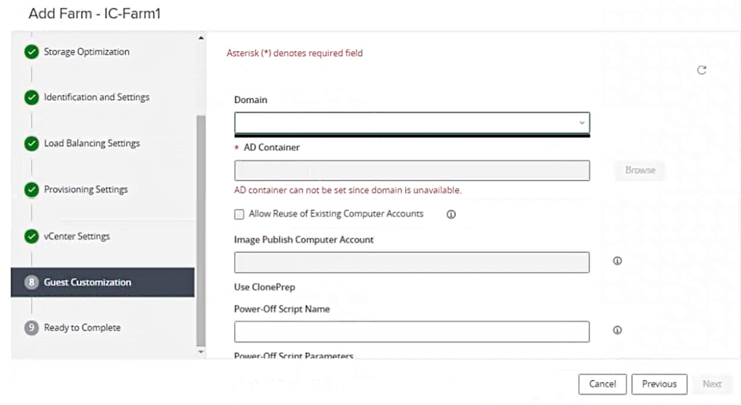 An administrator is trying to create an automated farm of instant-clone virtual machines using the Add Farm wizard. The administrator cannot proceed beyond the page displayed in the exhibit.