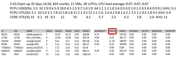 A VMware vSphere 6.x Administrator sees the following output in esxtop: