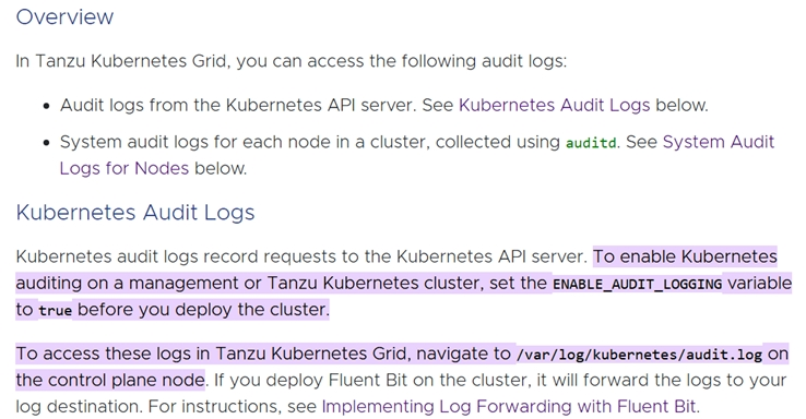 https://docs.vmware.com/en/VMware-Tanzu-Kubernetes-Grid/1.3/vmware-tanzu-kubernetes-grid-13/GUID-troubleshooting-tkg-audit- logging.html#:~:text=To%20enable%20Kubernetes%20auditing%20on,on%20the%20control%20plane%20node