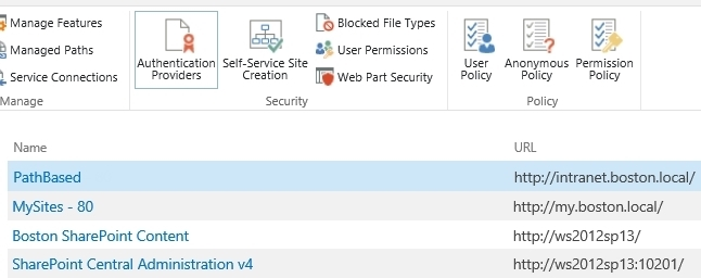 On the Application Management page, click the URL area of your desired webapplication. From the ribbon, in the Security section, select the Authentication