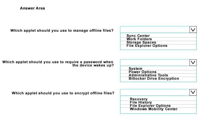Which Control Panel applets should you use? To answer, select the appropriate applet from each list in the answer area. Each correct answer is worth one point.