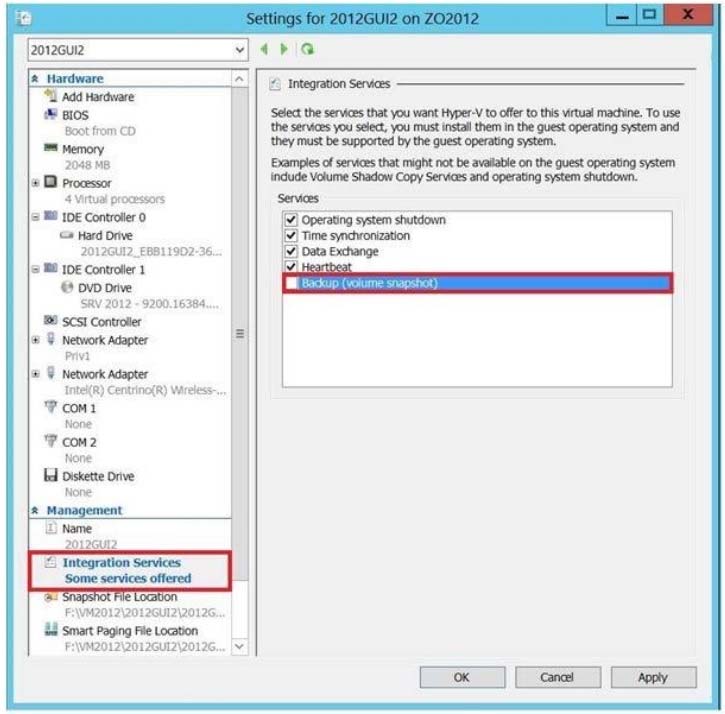 Application that is MySQL- aware and can back it up properly. For Applications for which no backup Application has a plug-in, you may need to have pre- and post-backup scripts that stop services or close Applications. If brief downtime is acceptable, you can disable the Backup item in Hyper-V Integration Services, thereby forcing Hyper-V to save the state of the VM during backup. This technique results in an image-level backup and can be used on any Application that doesn't have a VSS writer.