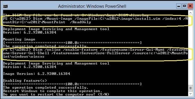 Dism /online /enable-feature /featurename:ServerCore-FullServer /featurename:Server- Gui-Shell /featurename:Server-Gui-Mgmt