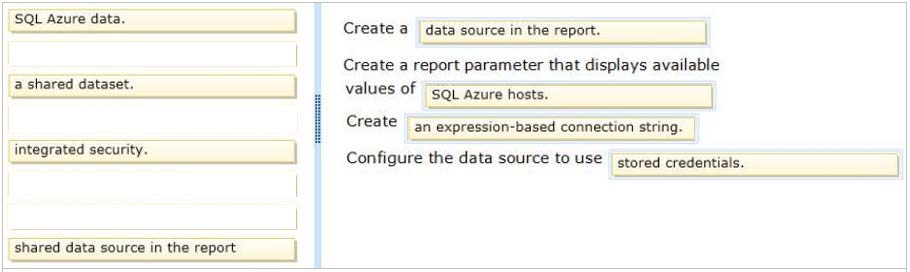 * A data connection includes the data source type, connection information, and the type of credentials to use. There are two types of data sources: embedded and shared. An embedded data source is defined in the report and used only by that report (fits this scenario). A shared data source is defined independently from a report and can be used by multiple reports.