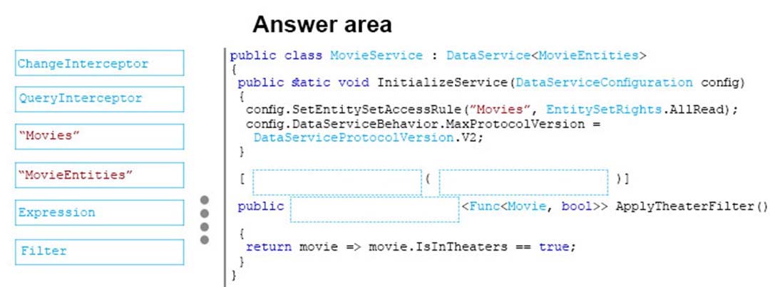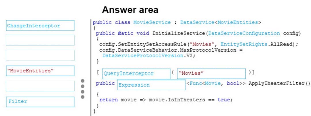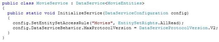 You are developing a WCF Data Services service in Visual Studio to display movie information from a SQL Server database that changes every 24 hours. The service is defined in the following class.