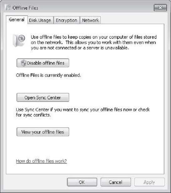 Files. This dialog box is also available using the Offline Files control panel. Using this dialog box, you can disable offline files, view offline files, configure disk usage for offline files, configure encryption for offline files, and configure how often Windows 7 should check for slow network conditions.