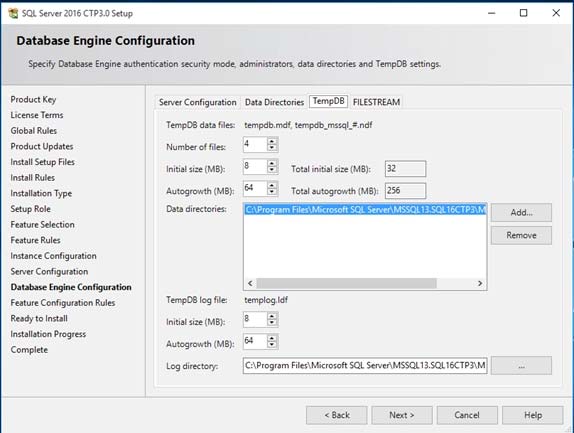 1. A new tab dedicated to tempdb has been added to the Database Engine Configuration step of setup workflow.