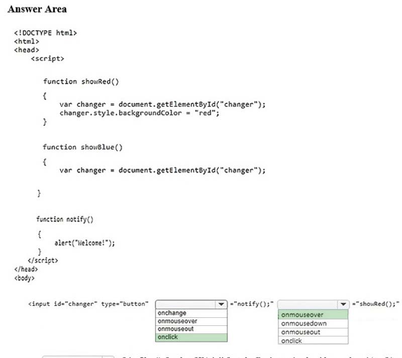 You are designing a web page that contains a blue button. When the button is pressed, it should call a function that displays the message "˜Welcome!'. When the cursor hovers over the button, the button should turn red. When the cursor leaves the button, the button should revert back to its original color of blue.