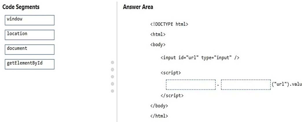 How should you complete the code? To answer, drag the appropriate code segment to the correct locations. Each code segment may be used once, more than once, or not at all. You may need to drag the split bar between panes or scroll to view content.