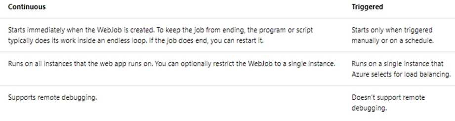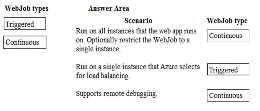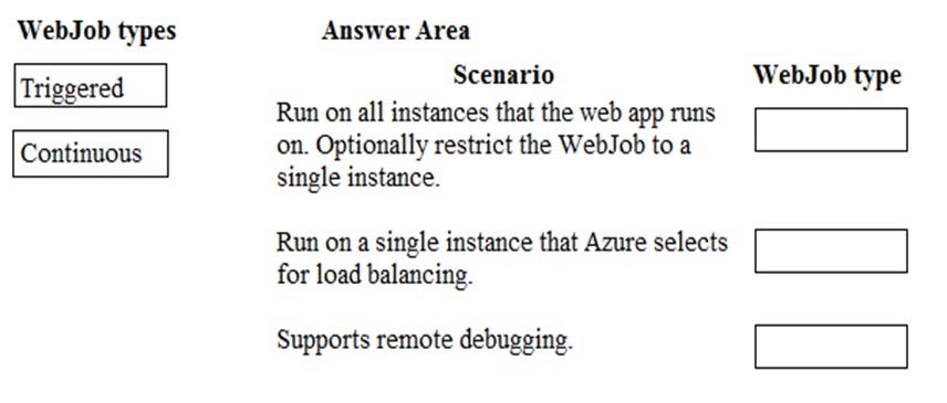 Which WebJob type should you recommend? To answer, drag the appropriate WebJob types to the correct scenarios. Each WebJob type may be used once, more than once, or not at all. You may need to drag the split bar between panes or scroll to view content.