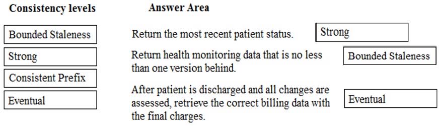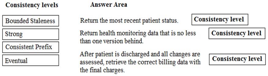 Which consistency levels should you implement? To answer, drag the appropriate consistency levels to the correct requirements. Each consistency level may be used once, more than once, or not at all. You may need to drag the split bar between panes or scroll to view content.