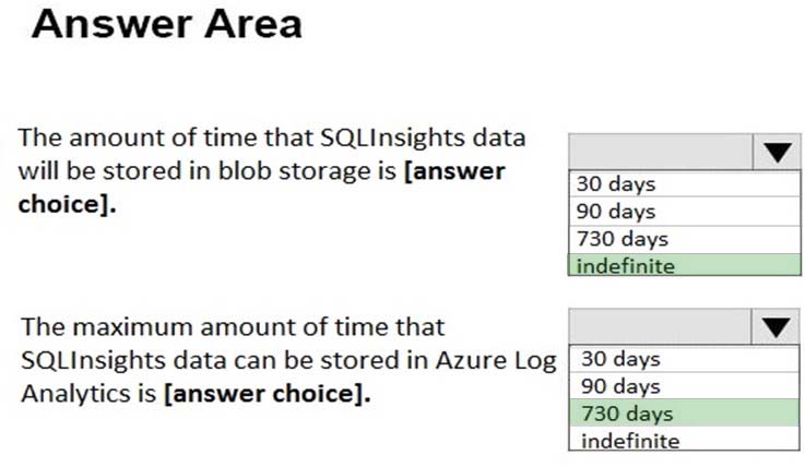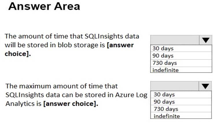 In the exhibit, the SQLInsights data is configured to be stored in Azure Log Analytics for 90 days. However, the question is asking for the "maximum" amount of time that the data can be stored which is 730 days.