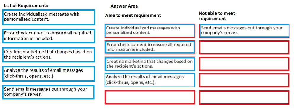 Which requirements will you be able to meet by utilizing the tools in Dynamics 365 for Marketing? To answer, drag the appropriate requirement to the correct column. Each requirement may be used once, more than once or not at all. You may need to drag the split bar between panes or scroll to view the content.
