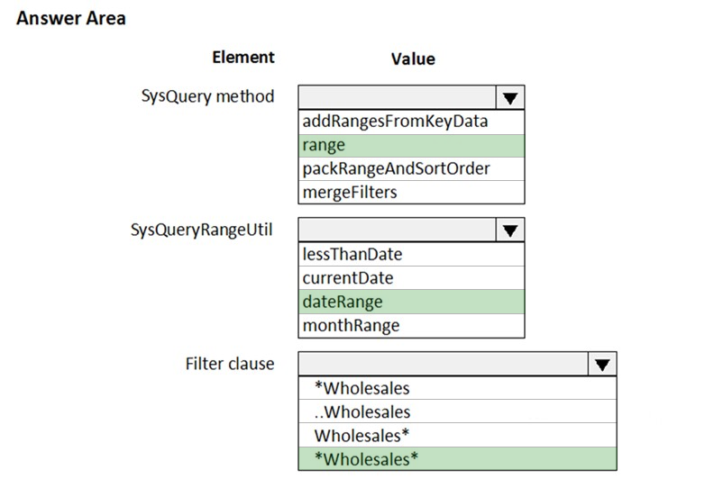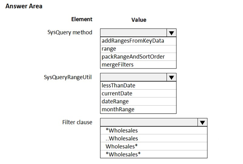 You must add default filters to the fleet management form. You must view only sales that occur in the current sales period and where the Customer name field contains the text Wholesales.