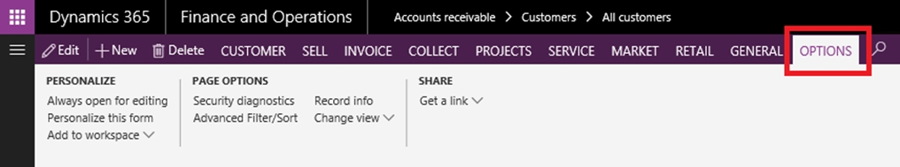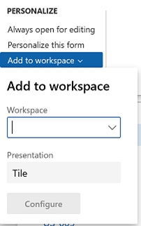 For some pages that include lists, the Add to workspace personalization feature is available in the Personalize group on the Options tab of the Action Pane. This feature lets you push relevant information from the current list to a specific workspace.
