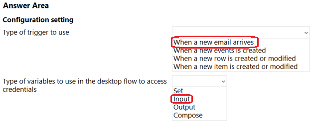 Each day the company receives an email that contains an attachment. The attachment lists orders from the company’s rail transportation partners. You must create an automation solution that reads the contents of the email and writes records to the ERP system. The solution must pass credential from a cloud flow to a desktop flow.