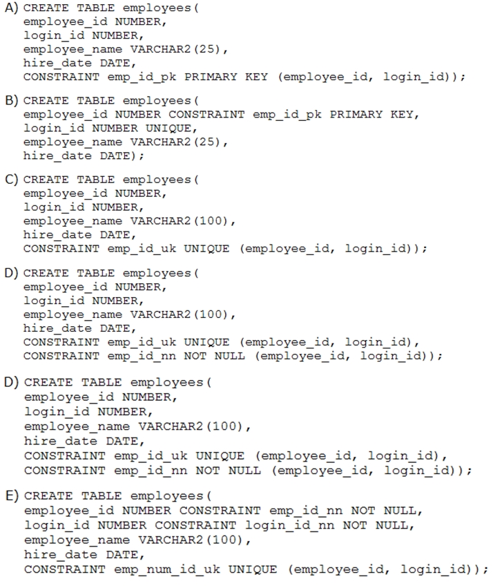 You want to create a table employees in which the values of columns EMPLOYEES_ID and LOGIN_ID must be unique and not null. Which two SQL statements would create the required table?