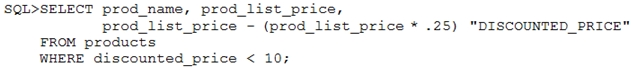 Using the products table, you issue the following query to generate the names, current list price, and discounted list price for all those products whose list price falls below $10 after a discount of 25% is applied on it.