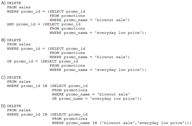You want to delete rows from the sales table, where the PROMO_NAME column in the promotions table has either blowout sale of everyday low prices as values.