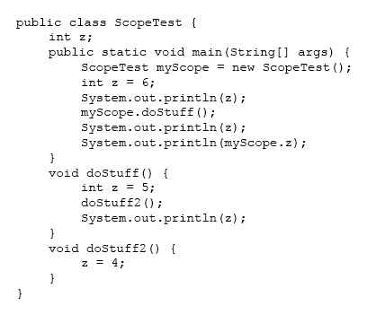 Within doStuff z is assigned 5.DoStuff2 locally sets z to 4 (but MyScope.z is set to 4), but in Dostuff z is still 5. z is printed. Output: 5