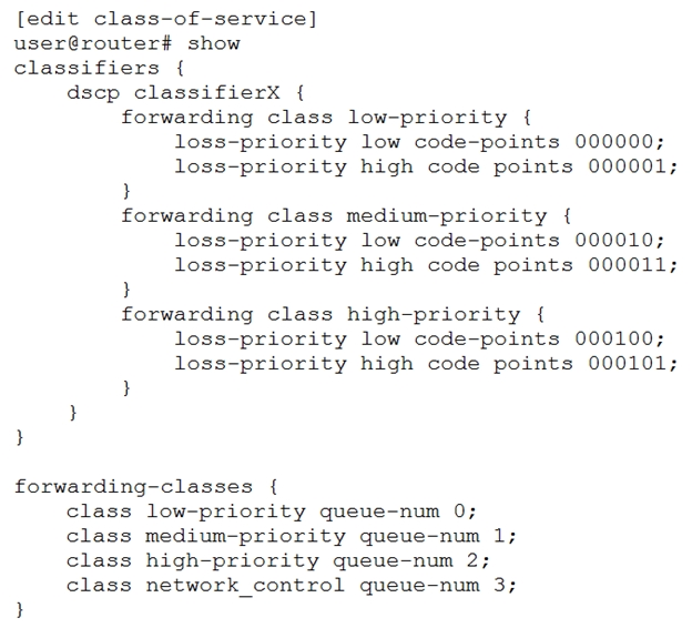 You manage an MX Series device which includes the configuration shown in the exhibit. Traffic marked with DSCP 000011 is entering the ge-1/0/4 interface at