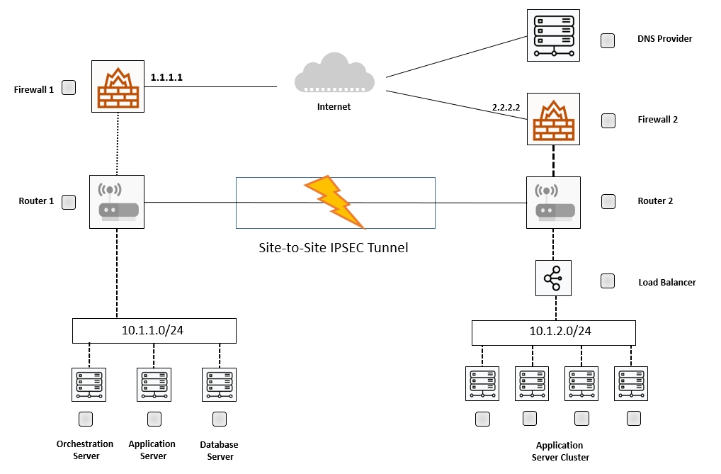 The remote computing environment is connected to the on-premises datacenter via a site-to-site IPSec tunnel. The external DNS provider has been configured to use weighted round-robin routing to load balance connections from the Internet.