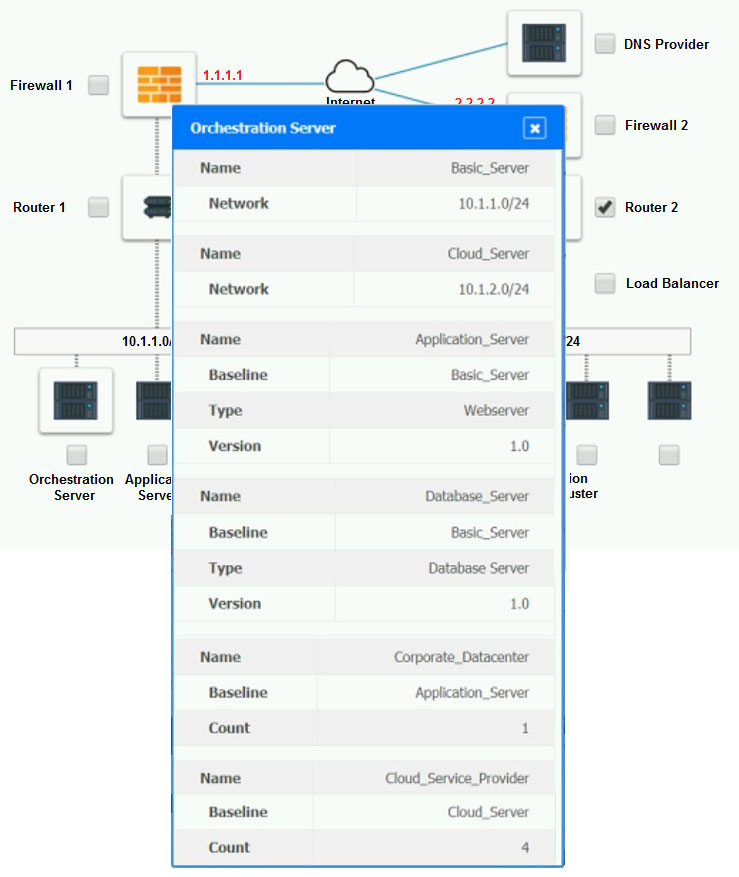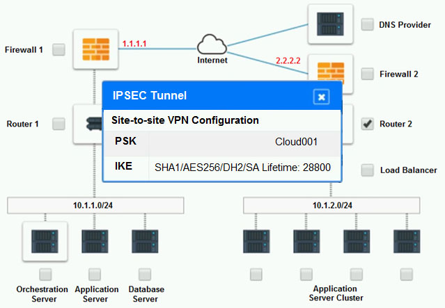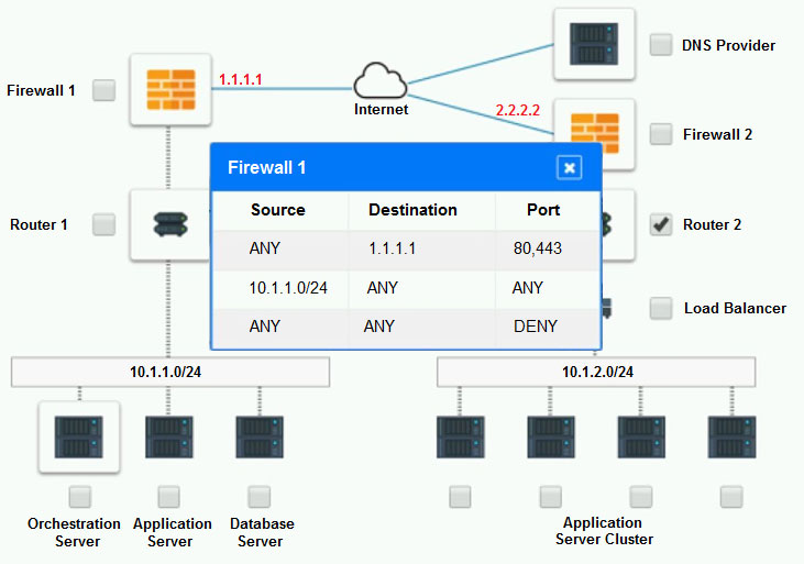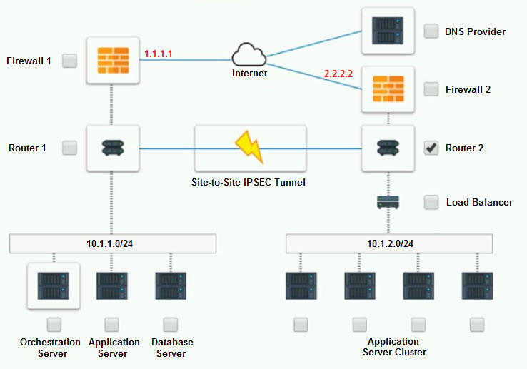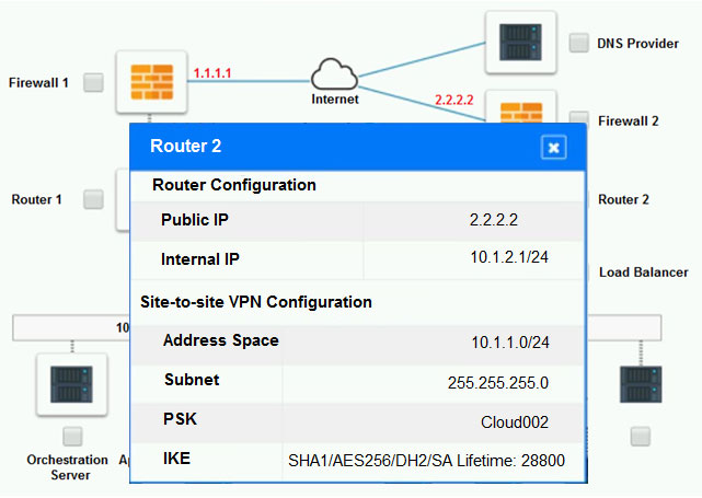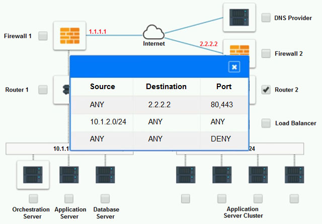 ✑ Analyze the configuration of the following components: DNS, Firewall 1, Firewall 2, Router 1, Router 2, VPN and Orchestrator Server.