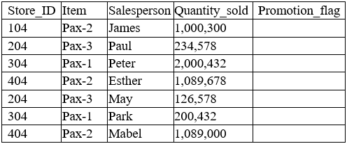 A data analyst has been asked to derive a new variable labeled “Promotion_flag” based on the total quantity sold by each salesperson. Given the table below: